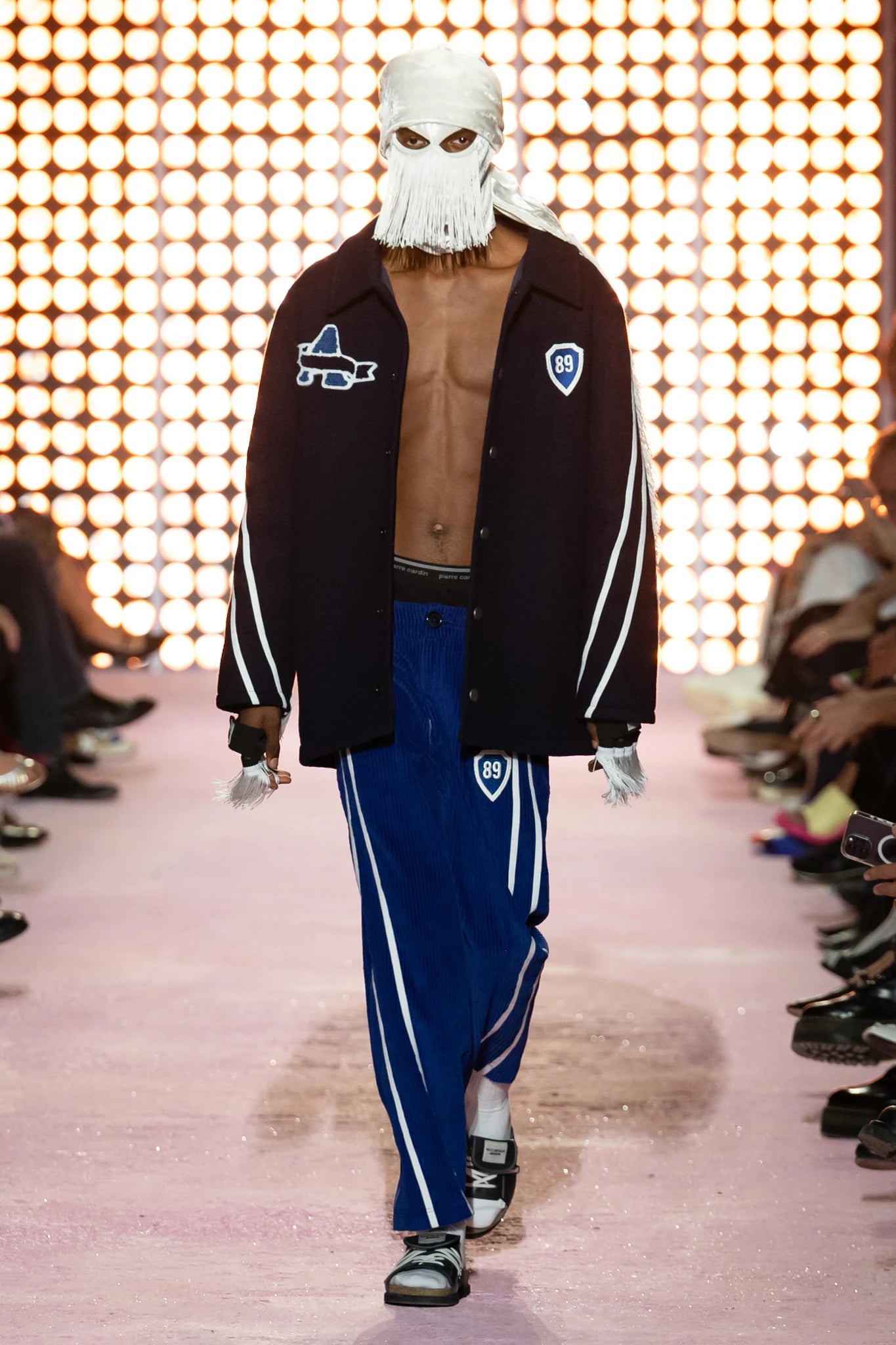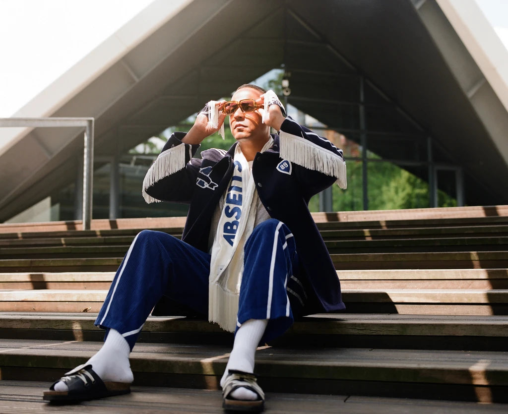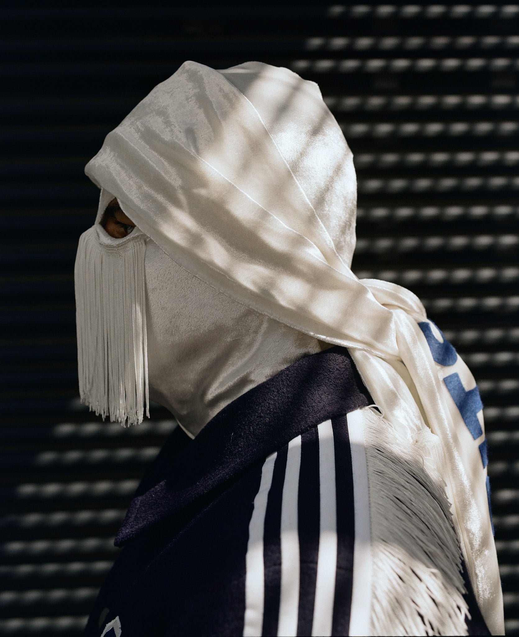Crafted from dead stock by L'Atelier des Matières, this outfit features the colors of AJ Auxerre. Inspired by supporters, we reimagined the classic American Varsity jacket. The lining is made from wool scraps, sourced from MOS'Laine. The balaclava, inspired by masks worn to protect against smoke flares, and the fringes, reminiscent of American attire and football scarves, highlight the fusion of cultures and innovative design.